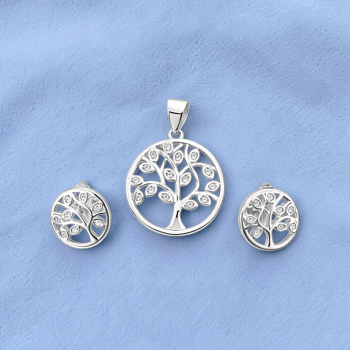 Elegant 925 sterling silver Tree of Life jewellery set featuring a round pendant and matching stud earrings embellished with sparkling cubic zirconia leaves. Perfect for everyday wear and gifting.